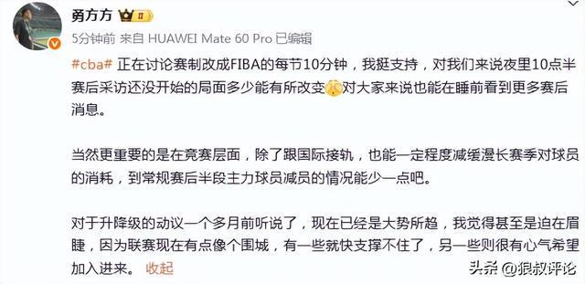 媒体人勇方方发文点评说道:正在讨论赛制改成FIBA的每节10分钟,我挺支持,对我们来说夜里10点半赛后采访还没开始的局面多少能有所改变,对大家来说也能在睡前看到更多赛后消息。当然更重要的是在竞赛层面,除了跟国际接轨,也能一定程度减缓漫长赛季对球员的消耗,到常规赛后半段主力球员减员的情况能少一点吧。对于升降级的动议一个多月前听说了,现在已经是大势所趋,我觉得甚至是迫在眉睫,因为联赛现在有点像个围城,有一些就快支撑不住了,另一些则很有心气希望加入进来。