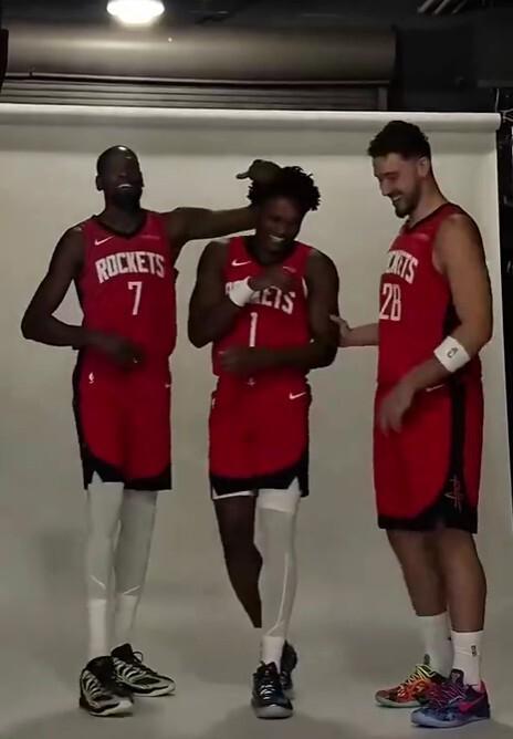 不久前有媒体上传视频,画面是火箭队拍摄定妆照。杜兰特和申京先出现在镜头中,随后阿门跑了过来。三人先是打闹一番,杜兰特和申京将阿门推到C位拍照。这一镜头引起火箭球迷热议,“看得出来阿门是球队老大了”,“杜兰特这脖子以下全是腿啊”,“这阵容,真期待新赛季啊”,大家都是调侃和点赞。