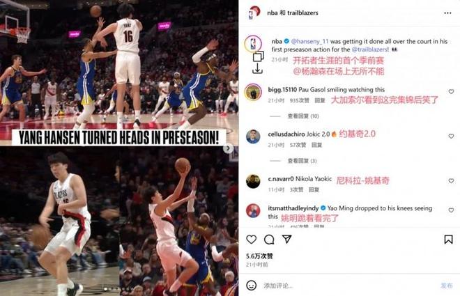 然而,美国网友和球迷和我们大不相同,他们却对杨瀚森四场季前赛的表现感到非常满意,在评论区对杨瀚森是赞不绝口,比如最近美国网友纷纷议论,有的说:开拓者首个季前赛,杨瀚森在场上无所不能,大加索尔看到这个完集笑了,还有好几个美国网友说,这是约基奇2.0,他梦还说杨瀚森年轻又帅气,大家赶紧给杨瀚森起个绰号吧。杨瀚森季前赛四场比赛之后,为什么中国网友和美国网友对杨瀚森的评价和看法完全不相同呢,主要是中国网友和球迷对杨瀚森的期望值过高,恨不得杨瀚森季前赛就大爆发,场场精彩,数据至少是10分10个篮板。