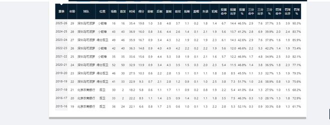 CBA生涯前三个赛季,贺希宁场均得分仅有个位数。来到深圳男篮后的五个赛季,他的场均得分从9.9分阶梯式攀升至15分。23-24至24-25赛季,他已能将场均得分稳定在16分左右。本赛季,贺希宁再次实现突破,场均得分暂时来到19.8分。